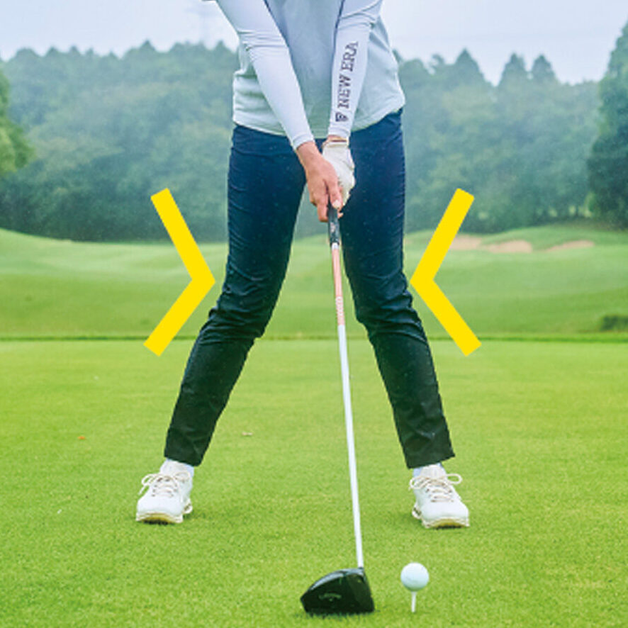 〝お尻をしめる〞がうまくできないと、力を入れているだけで骨盤が後傾してしまいお腹の力が抜けてしまう。こうならないためには、アドレス時に両足首を外側へねじるように力を入れる。すると、地面を足で強く踏みしめられ、その力が足の内側からお尻に伝わり、体幹も自然としまります。