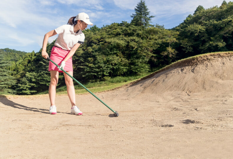 レーキを持って入ると、打ったあとにすぐにならせる。素振りやインパクト前にヘッドが地面に触れるのはペナルティ(2罰打)。数本持っていったクラブを置いたり、プレーに入る前に体を支えたりで、砂に触れるのはOK。