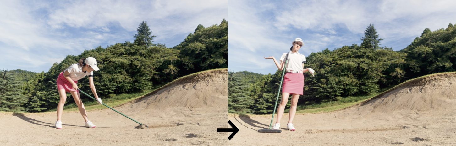 打ったあとはスピーディに砂をならして、すぐに次のプレーに進みたいですよね。打った跡や足跡は、力を入れすぎずにそっと撫でるようにレーキを前後に往復させる。入ってきた方向に向かって下がりながらならしていくと、足跡が増えませんよ。