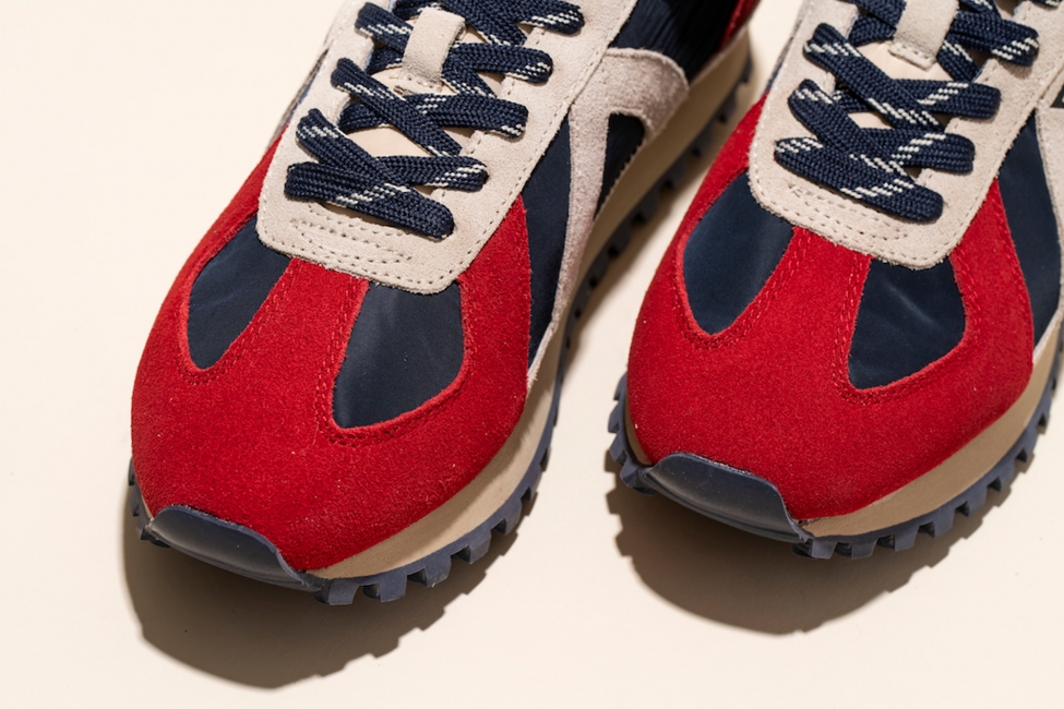 さらに、ドイツ軍が採用した”ドイツトレーナー”として知られるマラソンシューズからインスパイアされたスエードトゥのキャッププロテクションもしっかりキープ。機能性抜群な一足です。