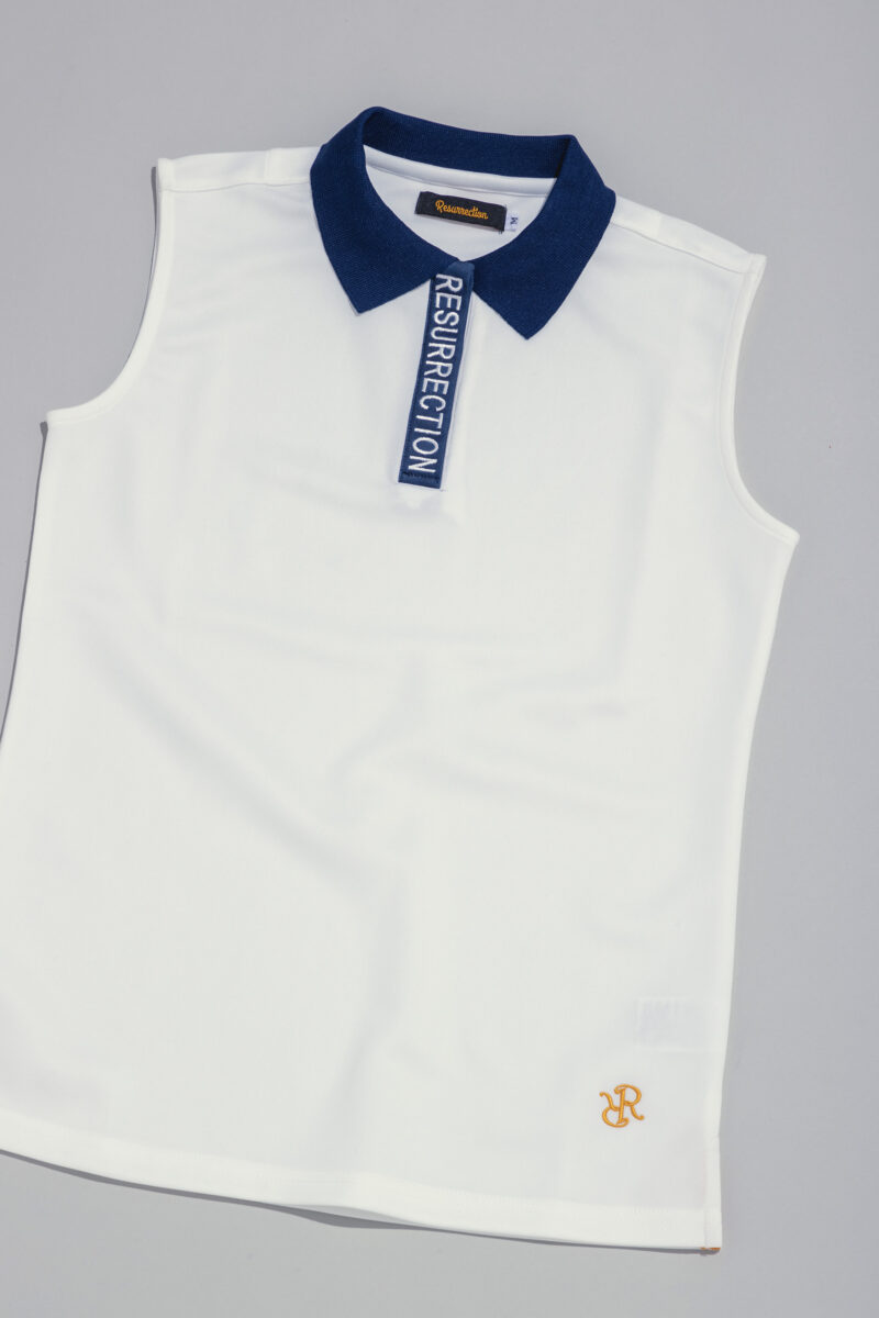 ホワイトボディ×ネイビーの襟と前立てのカラーコントラストが爽やかなノースリーブポロは、シンプルでレザレクションらしい上品さを感じられる1枚。”なんだか素敵”と思えるこの感じの良さは、デザインを首まわりだけにおさえることで叶ったバランスのいい“抜け感”によるもの。体をキリッと引き締めてくれる前立てのロゴ刺繍もポイント。