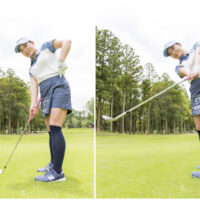肩甲骨の位置とやわらかさはとても大事。たとえば、猫背の状態で体を回すのと胸を張って回すのとでは、肩甲骨の可動域が大きく変わります。スイング時も肩を回旋させますが、このとき肩甲骨や肩まわりの筋肉が硬いとうまく回旋できず、パワーダウン。肩の柔軟性が低い人は、椅子とクラブを使った体操をしましょう。