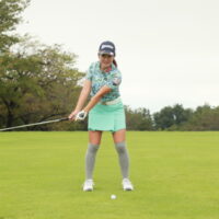 番手を上げてロフトが立ったクラブで転がすと、自然と横からヒットする感覚が生まれる。コースでは思いきって番手を上げて、小さく振って転がしで寄せるのがオススメだ。