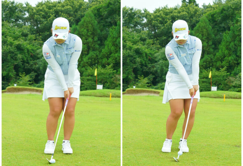 淺井選手の注目ポイントはインパクト。ボールを高く上げて寄せるタイプですが、アマチュアはボールを上げようとするとインパクトでフェースを寝かせてしまい、ダフりやトップのミスが出ます。プロは高く上げようとしても、アドレス時のロフトどおりにインパクトします。これは、ウエッジはロフトが寝ているので「ミートすればロフト通りに高く上がる」とわかっているからです。