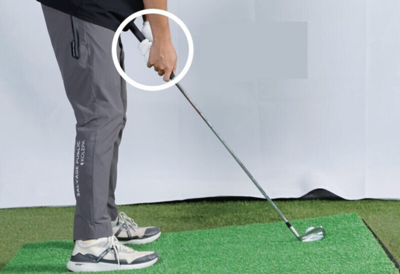 まず、クラブを短く握ること。基本的に、スイング軌道がフラットなら左に、アップライトなら右に曲がります。クラブを短く持つことでスイング軌道がアップライトになるので、右に曲がる要素が1つ加わります。極端に短く持つのもアリです。