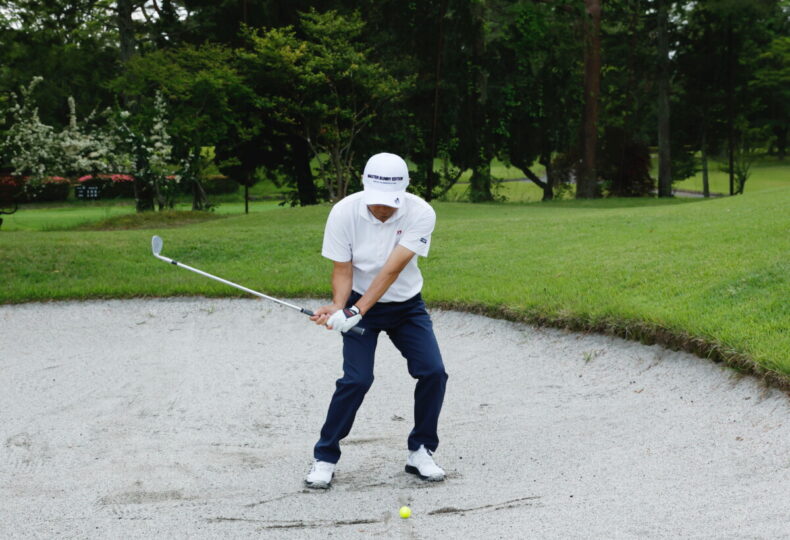 アドレスさえ決まればバンカーショットは簡単。あとはスタンスの向きに沿ってクラブを上げて下ろすだけ。