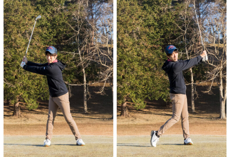 振り切らず手元は胸の前、シャフトを立てた形でフィニッシュ!