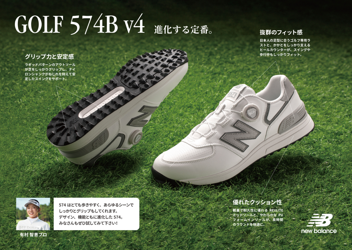 ニューバランス契約の有村智恵プロも、「これまで多くのニューバランスのゴルフシューズを履いてきましたが、574はフィット感も高く、軽く感じ、とても歩きやすいです。それでいてしっかりと芝を掴める感覚もあり、バンカーや湿ったターフでもしっかりとグリップしてくれます」とコメント。スコアメイクの土台となる“歩ける・ぶれない・疲れにくい”を、デザインと機能の両面から支える一足に仕上がっています。