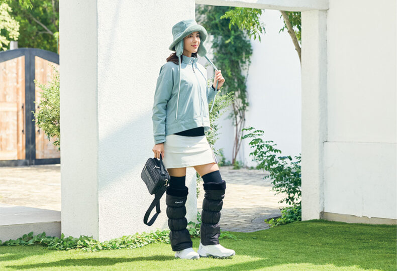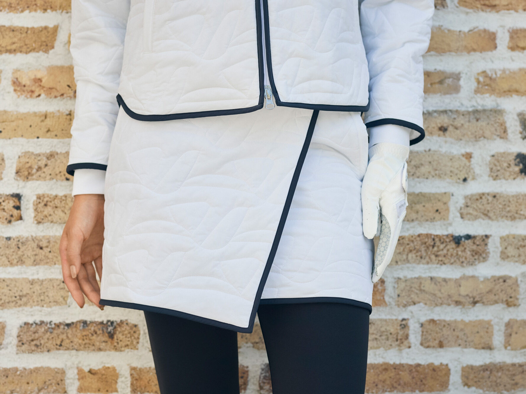 暗くなりがちな冬のゴルフスタイルを、ホワイトトーンで軽やかに。キルトデザインが印象的なジャケット&スコートは、上品な雰囲気と機能性を兼ね備えた一着。一見ラップスコートに見えるスコートデザインが、シンプルになりがちな冬のスタイリングのアクセントになってくれます。セットアップで着こなせば、シンプルながらも印象的なスタイルに。ボア素材のバケットハットやふわふわファー付きのレギンスなど、小物使いにも冬らしさを散りばめて。あたたかさもおしゃれも叶う、冬にこそ試したいホワイトコーデです。