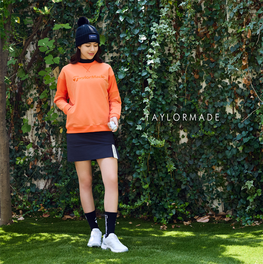ビビッドなオレンジが主役の秋冬スタイル。ソフトな風合いで風をしっかり防ぐ“ストームフリース”素材のトップスとスカートは、あたたかさと軽さを両立した優秀アイテム。ビビッドなカラーには、黒ソックスとニットキャップを合わせてバランスよく。スカートのポイントづかいのホワイトがバランスのいい抜け感を作って、全体がぐっと雰囲気よくまとまります。コースの緑の中でも、このオレンジならパッと華やぐ。寒さ対策をしながら、印象まであたたかく見せてくれるスタイリングの完成です。