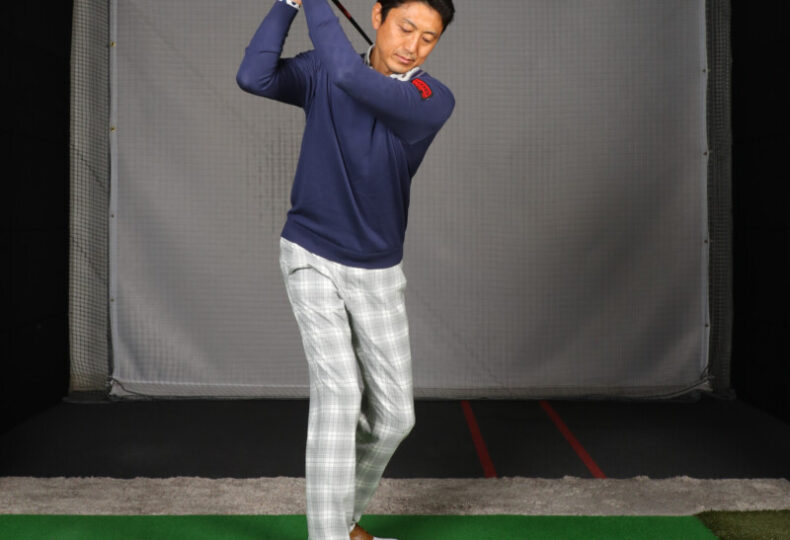 体の回転に対しての腕の振りは、手首のコックにつられてタテに振り上げるのが正解。実際のトップはもっとコンパクトにするが、タテに振り上げる感覚を身につけることが優先なので、ややオーバースイングになってもOKだ