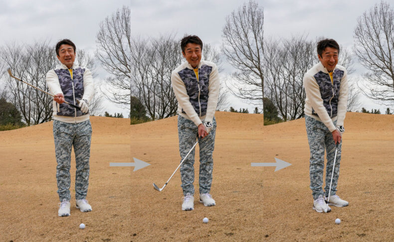 手先の動きを抑えながら、体をしっかり使ったアプローチを打つために、まずは構え方から変えていきましょう。