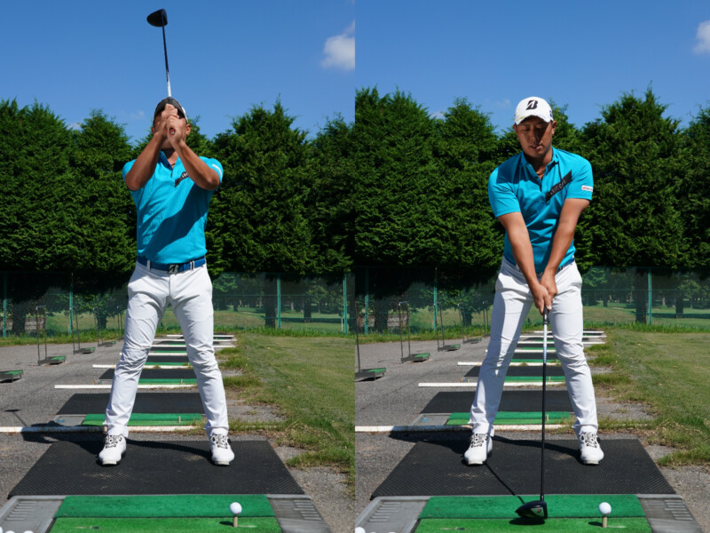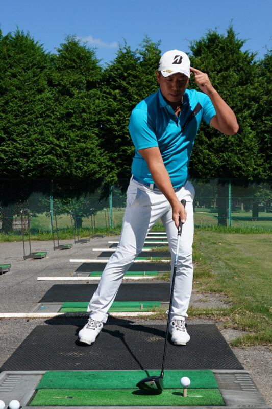 ドライバーはアッパーブローでボールをヒットするのが飛ばしのコツ。構え方はボールを左足の前にセットしたら、剣道の面打ちのように頭の真上から真っすぐクラブを下ろしてください。
