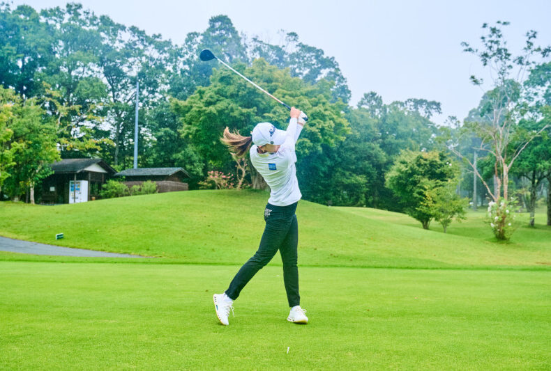 「シンプルに、クラブを振っていて〝気持ちいい〞と感じるのを1番大事にしています。そのために、軸を保つ最低限の力は入れ続けています」と宮田。自身が違和感をもつ動きは、スムーズなスイングを途切れさせ、結果的にパワーロスにつながる。丹田に力を入れて軸を作り、しっかりと下半身をリードさせてから上半身を動かす。この連動をスムーズに行なうことで、クラブの自然で正しい動きを引き出し、精度と飛距離を両立させているのだ。