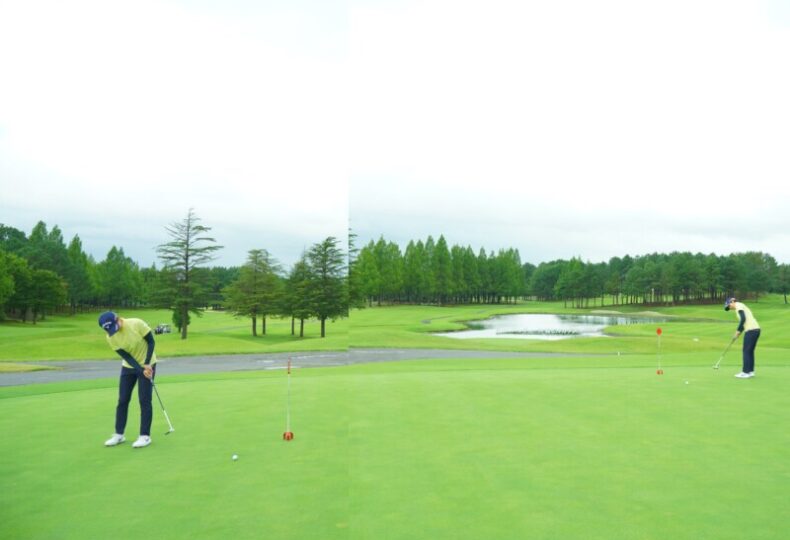 素振りはボールを見ずにカップだけを見て行い、「この距離感ならこのくらいの振り幅とボールスピードで転がす」というイメージを作る