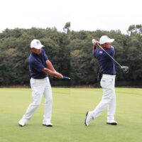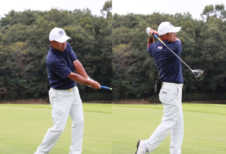 「とくに下半身の筋力が低下している中高年は、ボールを叩かないほうがいい。腕力に頼ってしまい、手打ちのミスを招くからです。それよりも肩や腕の力を抜き、フィニッシュに向けてヘッドを走らせていきましょう。シャフトで背中を叩くつもりで振れば、正しい円軌道になってバランスが向上。余計な力を入れなくても、ヘッドが効率よく加速し飛ぶようになりますよ」