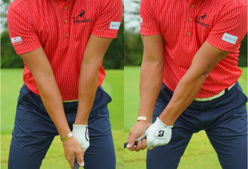 まずバックスイングは、右ヒジを体から離したほうがパワーが溜まります。僕は、肩右サイドが前に出て溜めたパワーがボールに伝わると腕の三角形をキープすると力がまったく入らないので、シャットフェースでやや外に上げます。