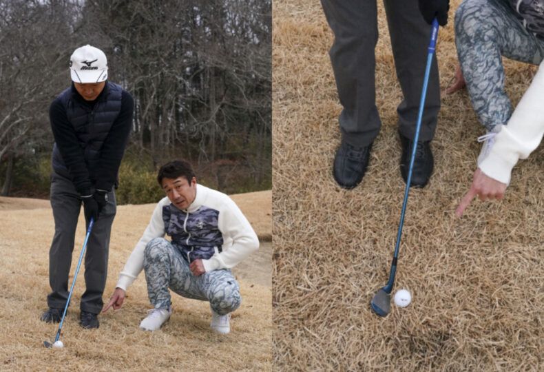 左足下がりは球を上げにくいので、転がすほうが安全です。転がしはボールを右に置きたくなりますが、右サイドが高いので、ヘッドを急角度で下ろさないと当たらない。当たらないどころかヘッドが刺さりやすくなるためダフってしまうのです。