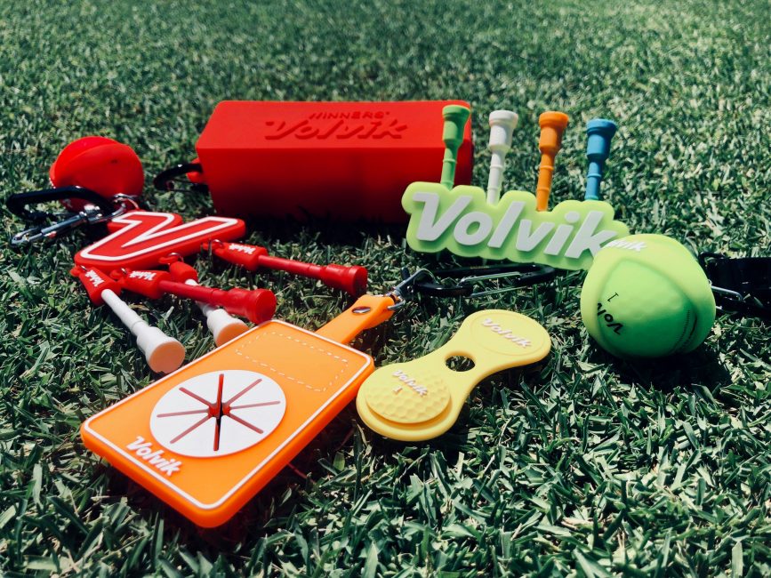 中央奥から時計回りに、パンチのあるレッドの〈ボールポーチ〉、ブランドロゴがインパクトのあるグリーンの〈パターキャッチャー〉、キャップやパンツのポケットに付けられるイエローの〈クリップマーカー〉、鮮烈なオレンジが特徴の〈タオル&グローブホルダー〉、ブランドの「V」が大胆なレッドの〈ボール&ティーホルダー〉の5種類。ポップなデザインもいい感じ!