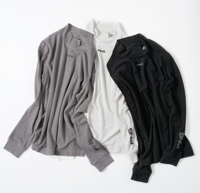 春夏も半袖モックネックシャツがトレンドだったけど、この秋冬もモックネックシャツは注目アイテム。一枚でもインナーにも使えちゃう万能さはもちろん、ポロシャツとは違うモダンでスポーティな雰囲気がおしゃれゴルファーたちから支持されている理由。特に〈ピン アパレル〉のモノトーンカラーを選べば、シンプルシックにスタイルに取り入れやすい!